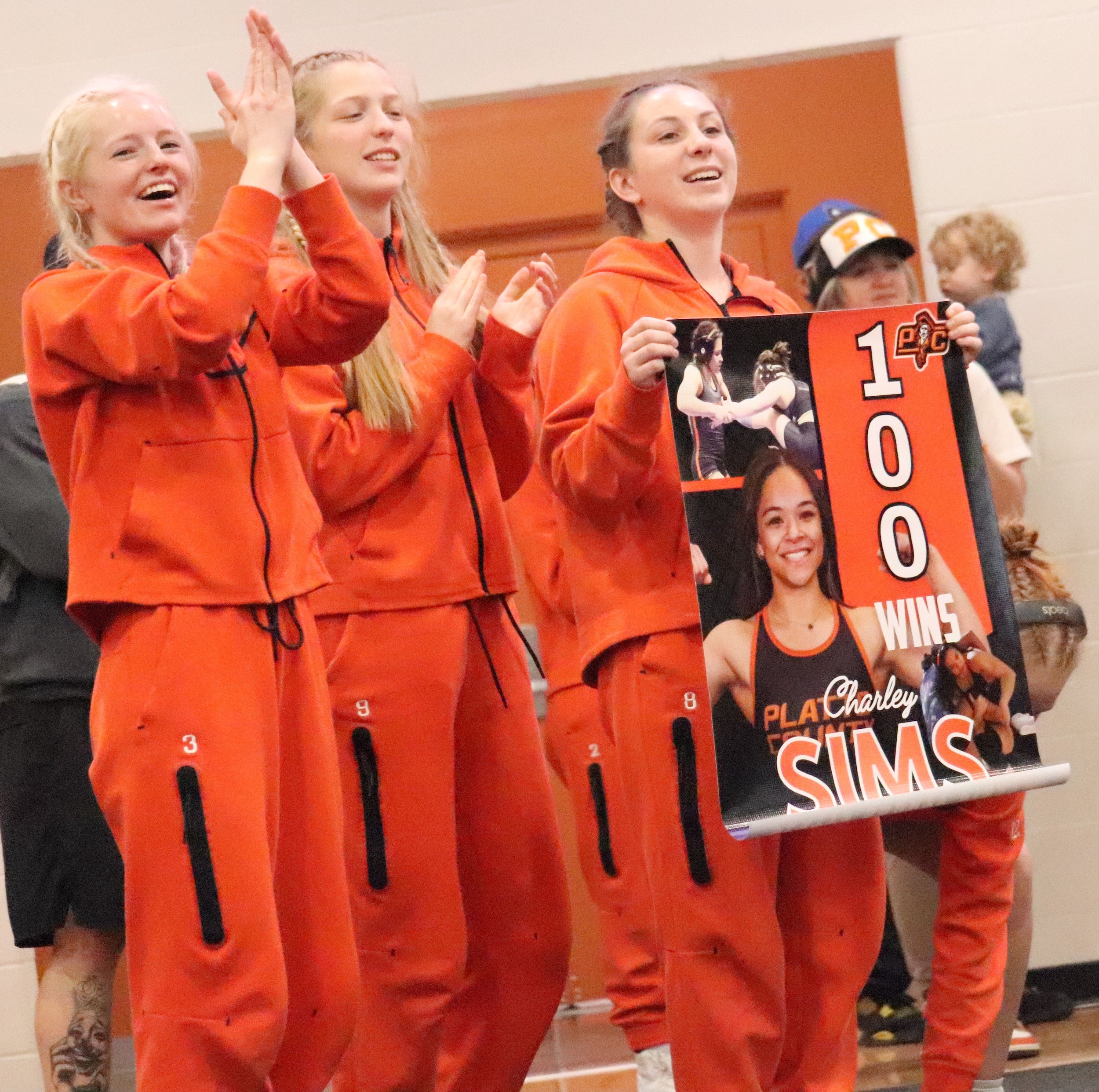 Platte County wrestlers celebrate Charley Sims’ 100th win after her district championship.
