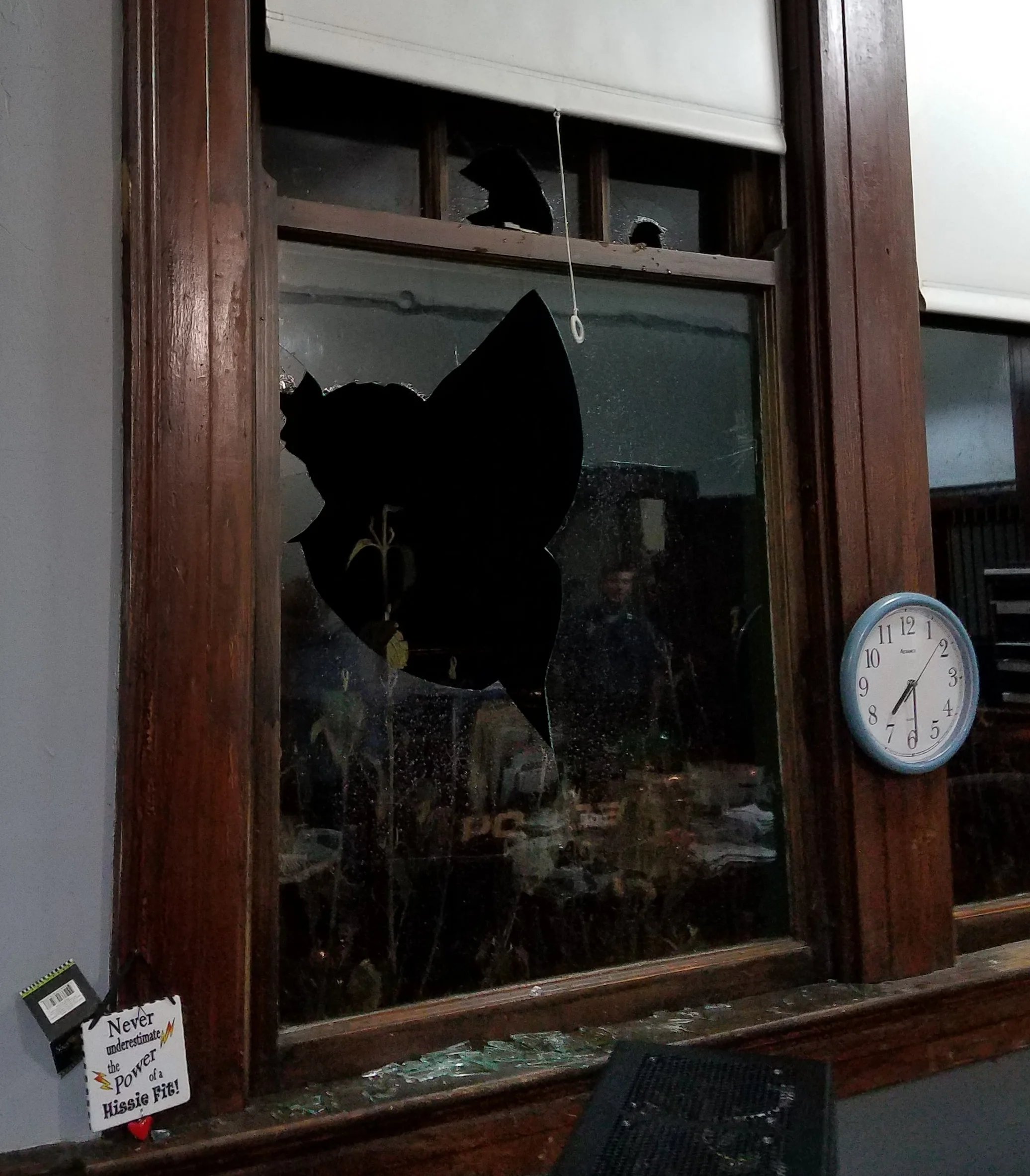 “There was glass and water everywhere,” Kirby said of the sight that greeted the staff when they emerged from the basement. “The hail looked like snow on the ground outside.”
