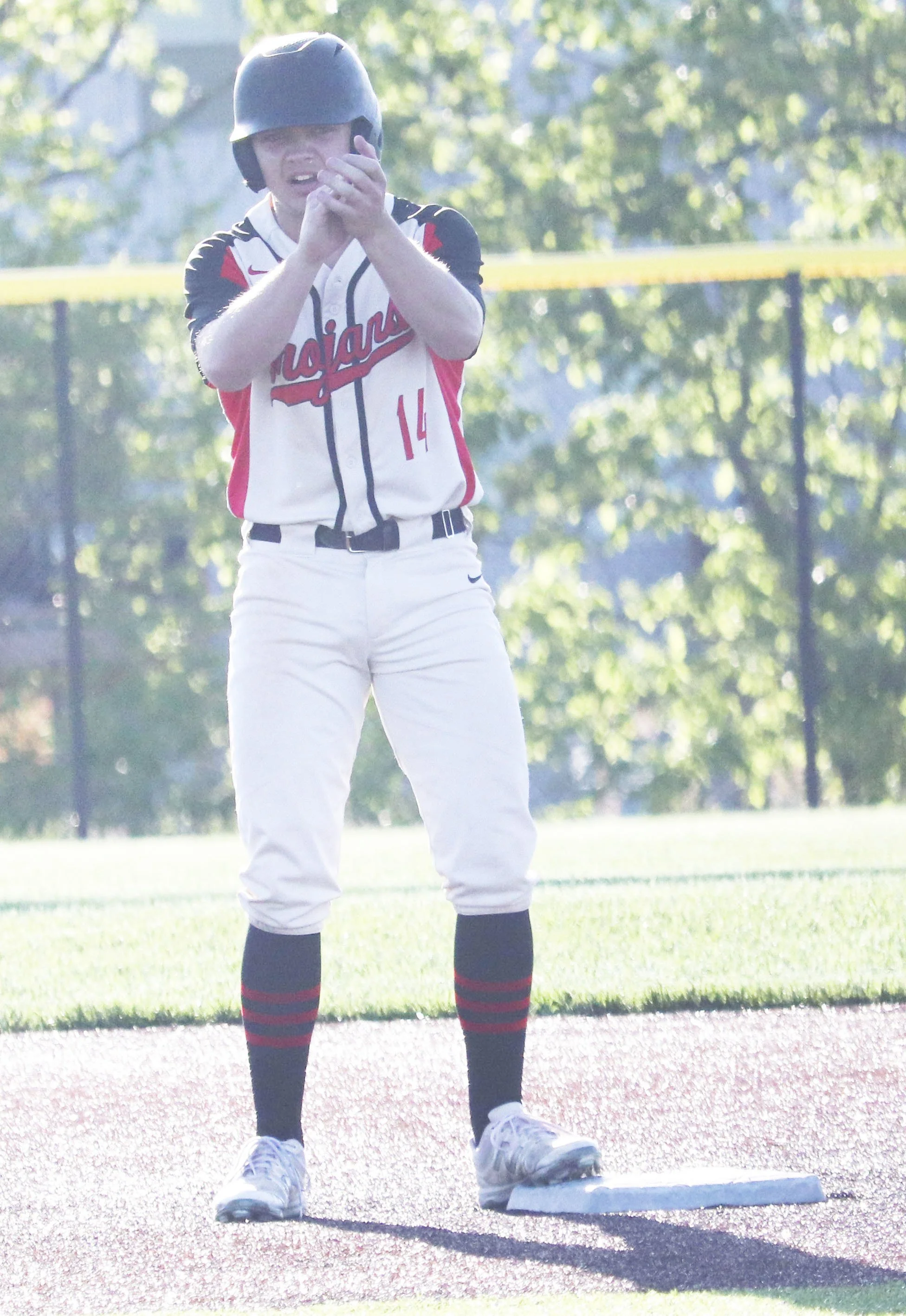 Park Hill’s Aiden Brooks claps in the first inning after hitting a double in the Trojans 3-1 upset win over Staley on May 16.
