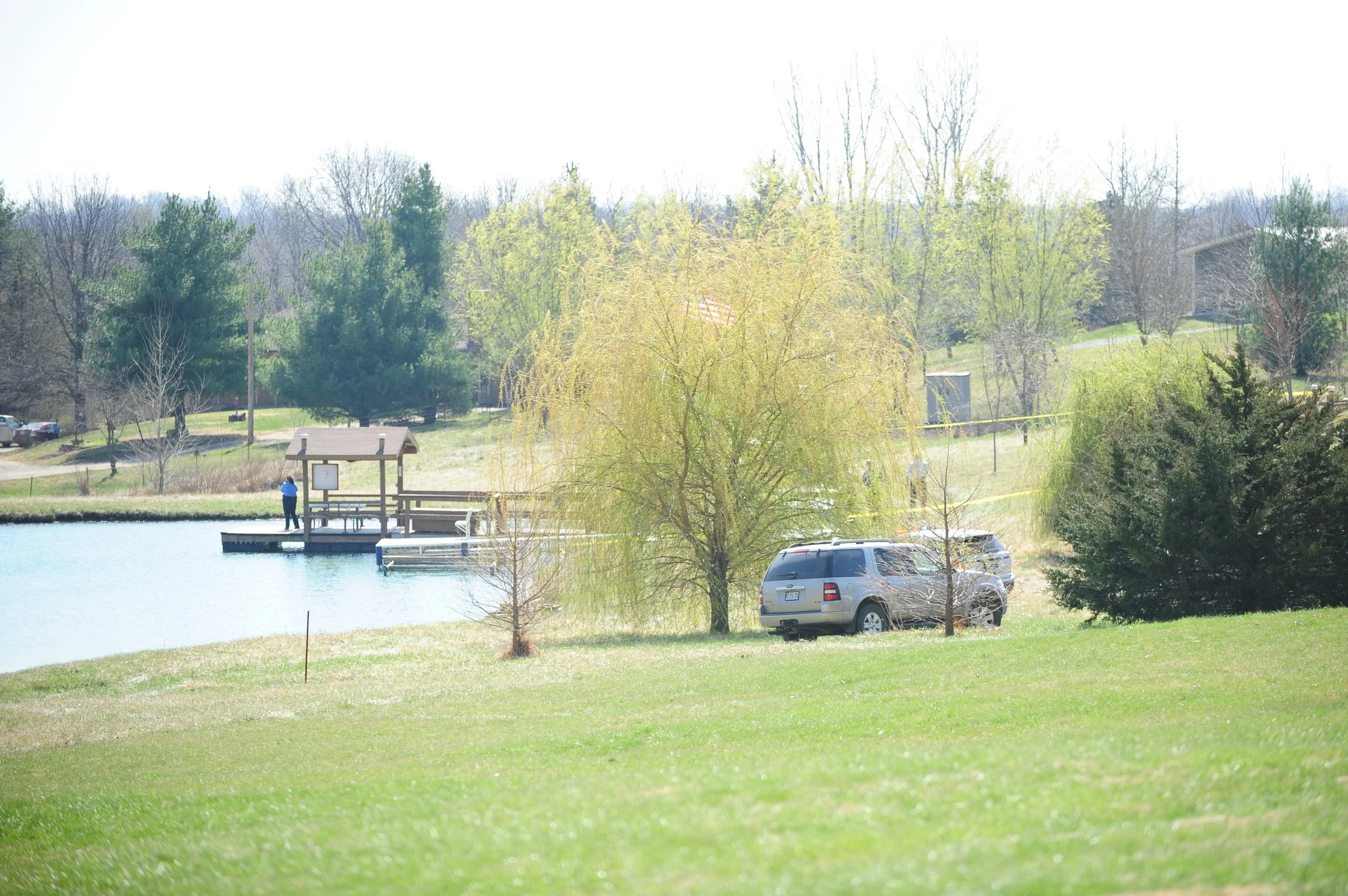 Investigators continued to gather evidence at a pond on the afternoon of Monday, March 20 near Ridgely, Mo. after the apparent accidental drowning deaths of Arrabelle and Elijah Wagner, three-year-old twins who lived in a home nearby.