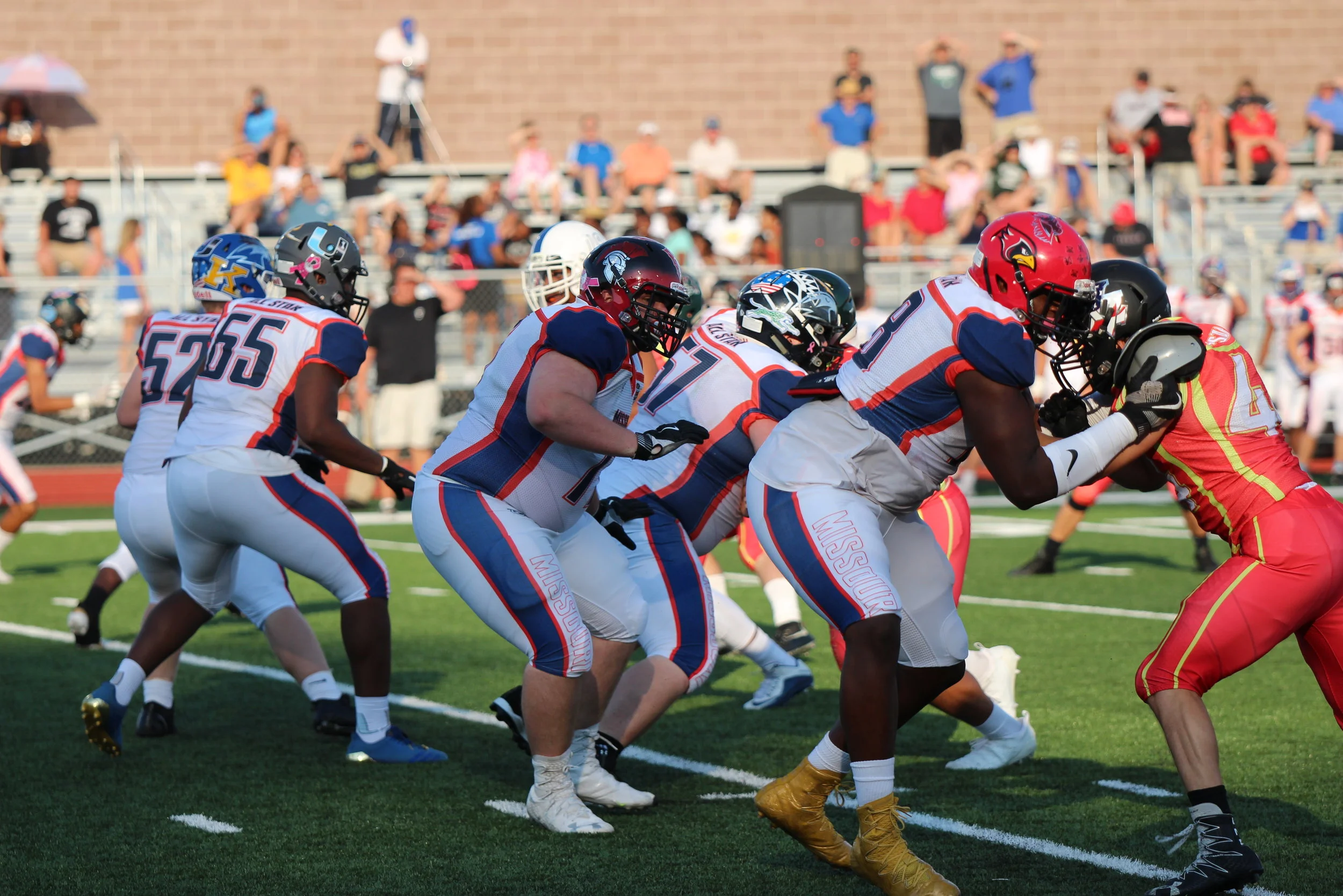 Missouri’s defensive line stopped St. Thomas Aquinas quarterback Will Swanson at the 1-yard line to force a turnover with 2 minutes, 31 seconds left in the first quarter on Thursday, June 14 at Pioneer Stadium in Leavenworth, Kan.