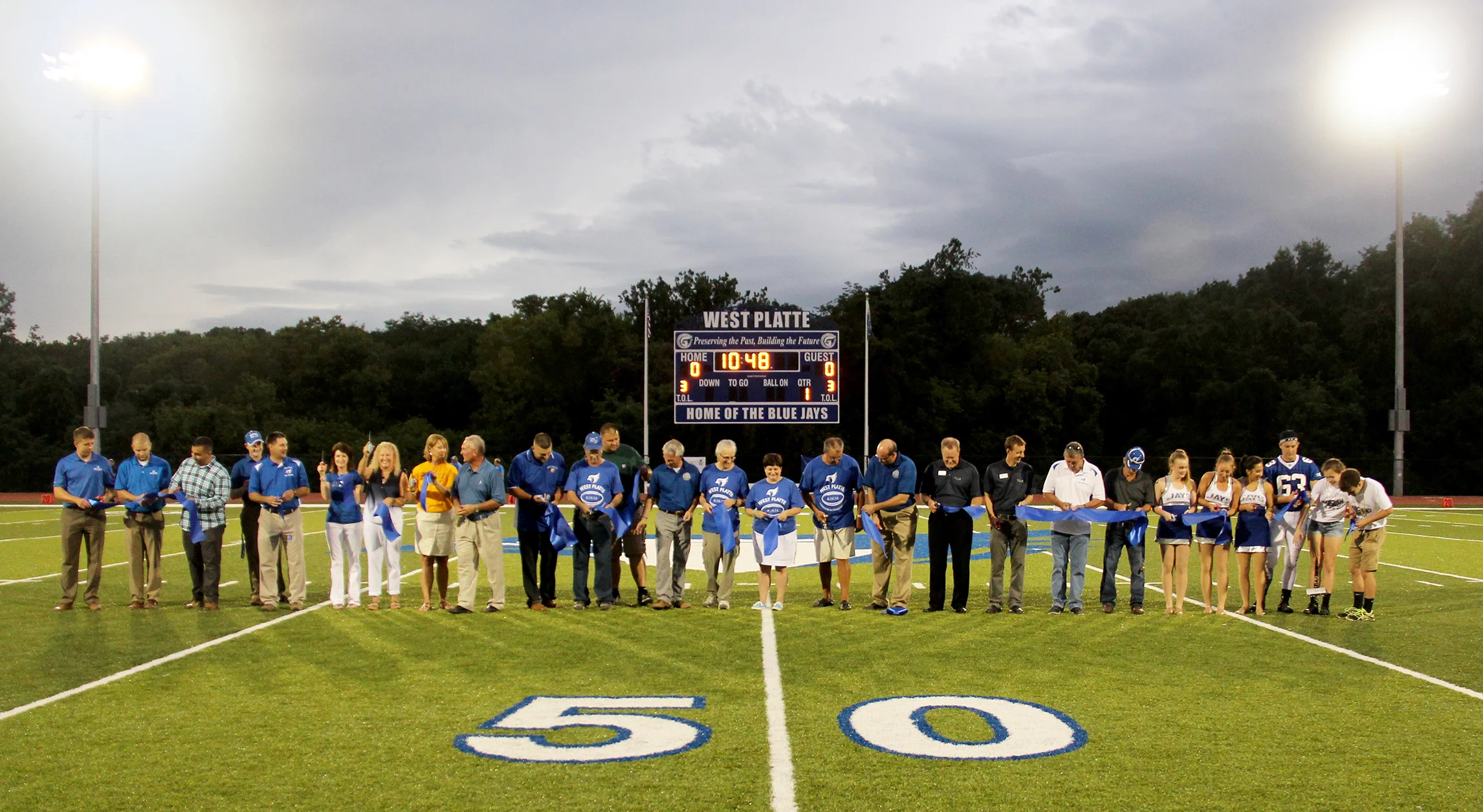 After about 10 minutes, all of the special guests cut a piece of the lengthy ribbon, spanning 7 yards on either side of midfield on the new Rudolph Eskridge Stadium turf at West Platte High School. Then the head official for the Bluejays football game blew his whistle and ordered the assembled crowd to vacate with lightning in the area and storms approaching.