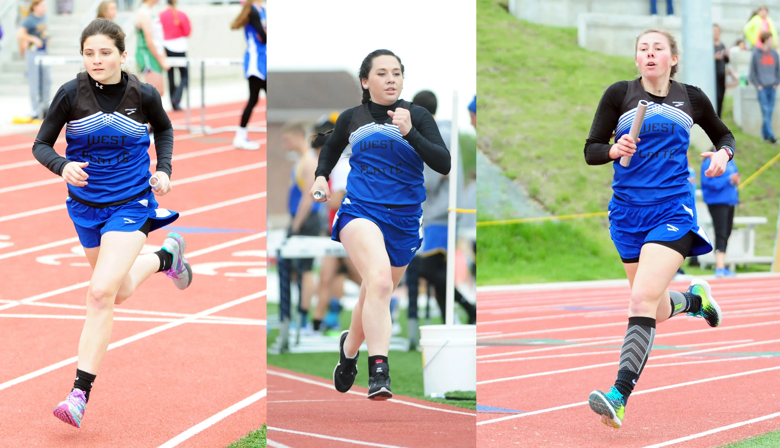 West Platte sophomore Lea Moose (left), junior Sikoya Richard (center) and junior Rachel Heili (right) ran in the 4x800-meter relay, helping the Bluejays finish third..