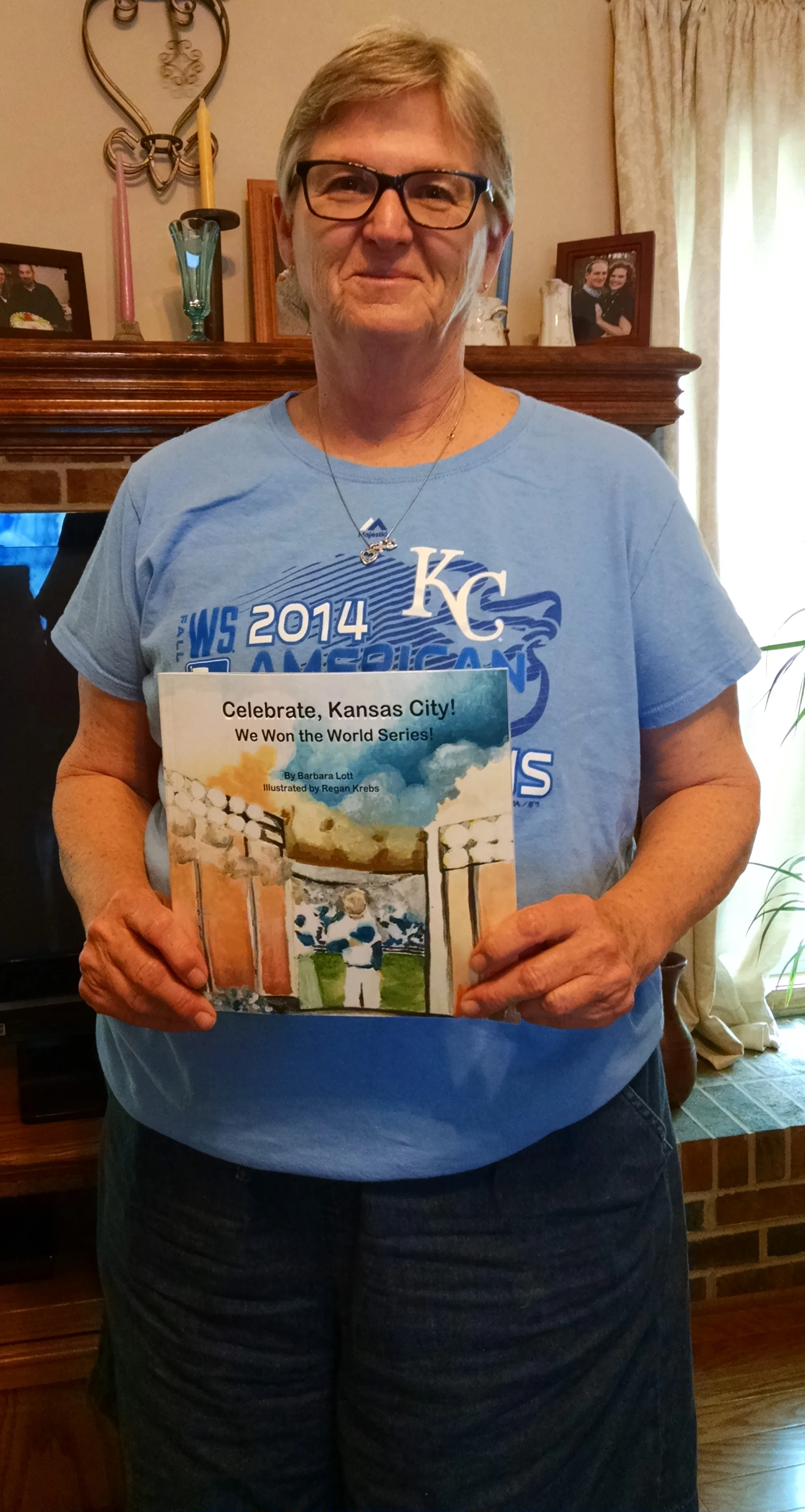 Barbara Lott of Weston, Mo. poses with a copy of her book, “Celebrate, Kansas City! We Won the World Series!” Lott self-published the book.