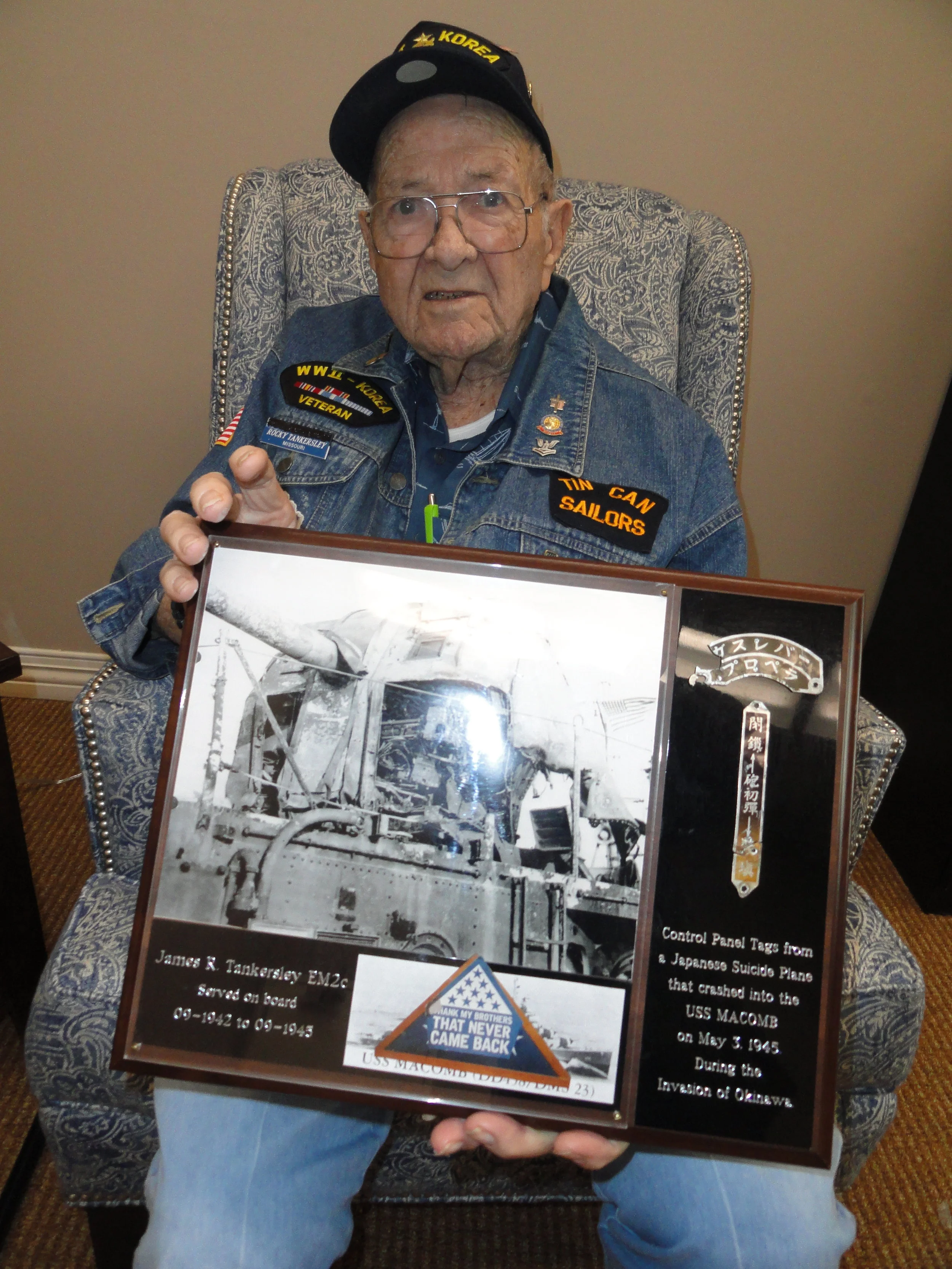 “When the Kamikaze plane hit the whole rear end of the ship was on fire so we had to fight the fires,” Tankersley said. “I was on the fire hose and one of the officers yelled for an electrician to kill the power to the back end of the ship so I handed the hose to another guy and I had to go around on the other side of the ship to get to that panel to turn the power off so they wouldn’t squirt water on all those electrical panels. When I went in I saw this guy laying there and I didn’t realize who he was at the time, he was so badly injured and burned. So after I got the power turned off I went back to see if I could help him. I tried to move him and his skin just came off. The only clothing he was wearing was his belt. The rest of his clothing had burned up. I tried to get him on a stretcher by myself. I hollered for help and another guy came in and we were able to get him up. We carried him down to the sick bay but there was nothing they could do for him. Some people were screaming. It shakes you up. We went into the port in Okinawa and they sent in barges to pick up the dead bodies. When you saw all those bodies in the canvas bags on the barge and you knew that some of them were your friends, it was a touching moment. They took them to shore to be buried at the beach.”