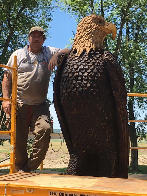 Local artist TJ Jenkins poses with a chainsaw carving of an American bald eagle. He finished the project over the summer, transforming a dead tree into an artistic display at English Landing Park in Parkville, Mo.