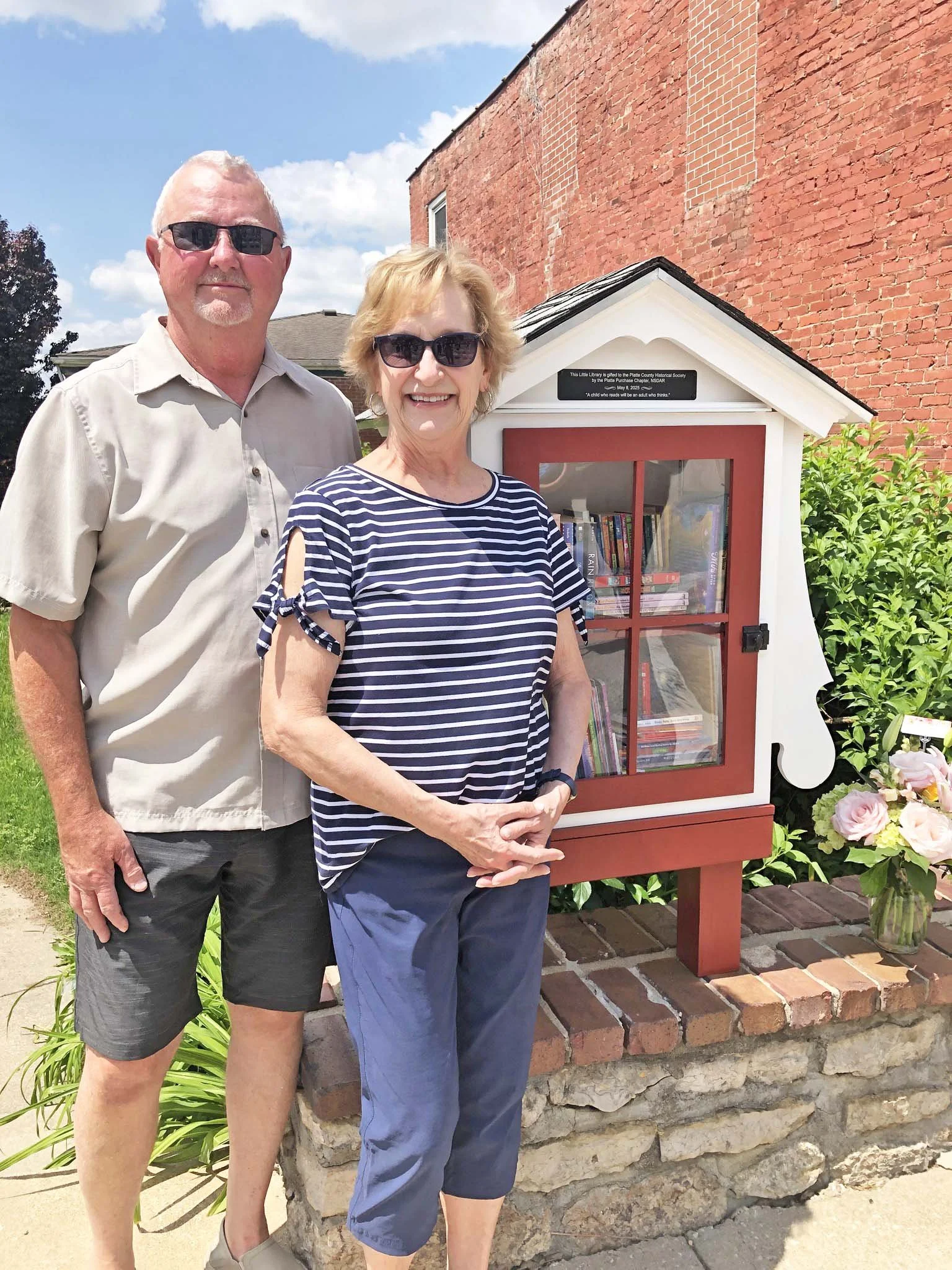 Dave Roach (pictured here with Clarice Roach) built the Little Lending Library for the Platte Purchase Chapter of the Daughters of the American Revolution.