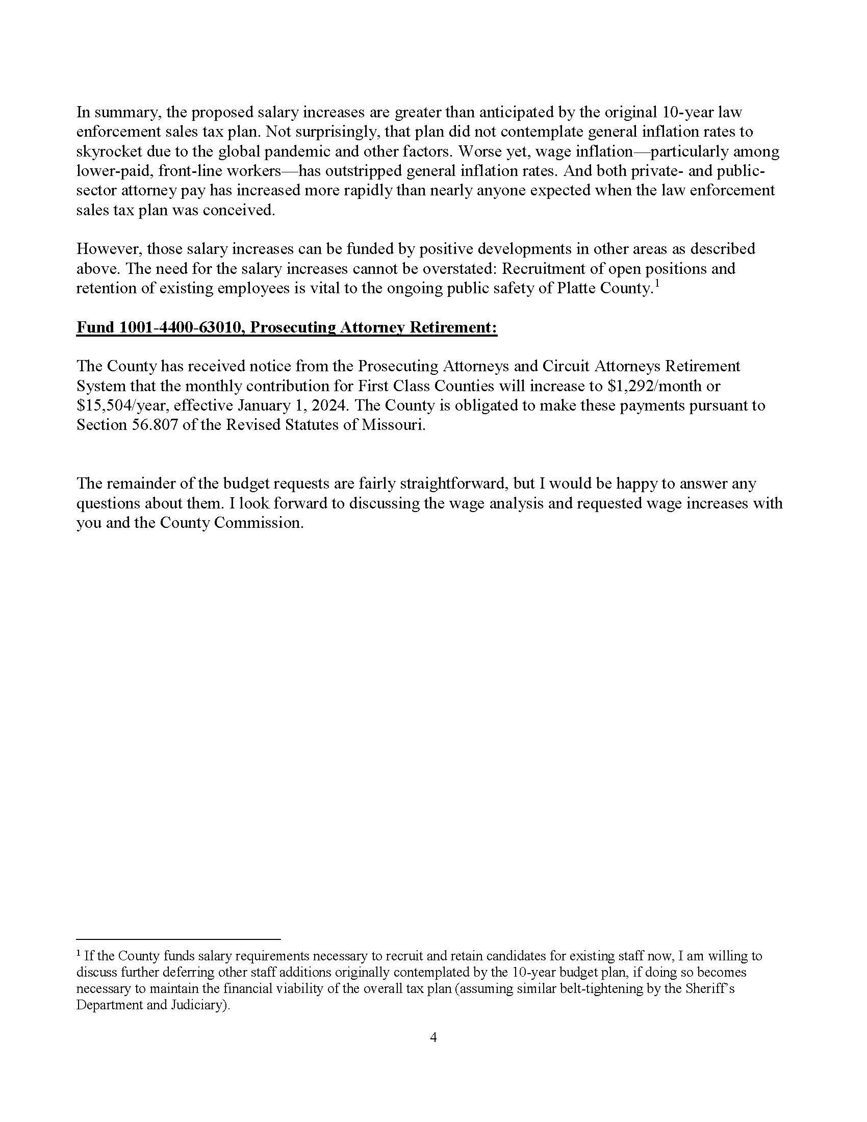 “The increase in compensation the sheriff and I are awarding our employees (by cutting planned expenditures from other budget lines approved by the commission) is not a ‘1 percent increase,’” Zahnd wrote. “It is 5 percent, in lieu of a meager 2.5 percent ‘COLA’ imposed by the commission’s unilateral cuts from Platte County budget officer and Auditor Kevin Robinson’s statutorily-mandated balanced budget. Second, I did not ‘close’ Platte Cares. I reluctantly removed traffic offenses committed by drivers under age 21 from the program. Third, while the budget for Platte Cares ‘is $25,000 which amounts to roughly 1 percent of all salaries in the prosecutor’s office’ (because most Platte Cares expenses are paid by $300 participant fees), I felt compelled to find money for 5 percent salary increases for assistant prosecuting attorneys and other staff in my office from somewhere else in my budget, as authorized by Missouri law. I also reluctantly cut a much larger sum from our office’s ‘court costs’ budget line, which funds a variety of expenses used to try cases, including expert fees, deposition and transcript expenses, costs for obtaining prior convictions from other jurisdictions, and similar expenses.”