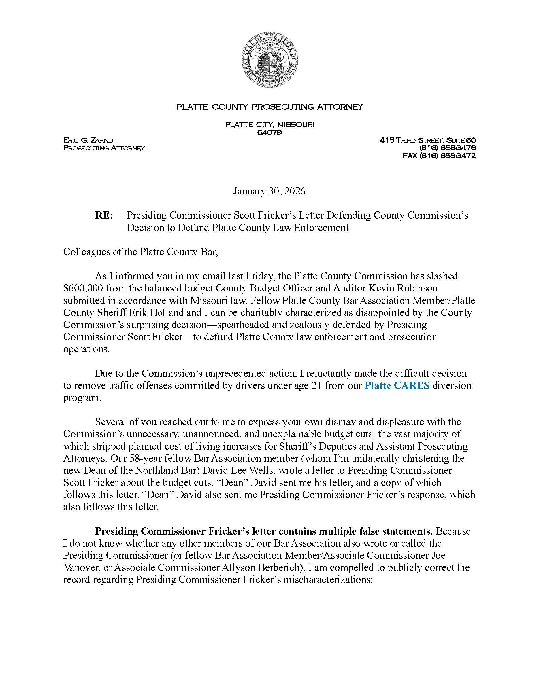 In a letter issued at the end of January, Prosecutor Eric Zahnd called out the Platte County Commission for $600,000 in budget cuts and addressed the end of the Platte Cares diversion program for traffic offenses committed by those under 21 years of age.